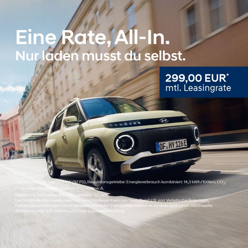 Mit dem Hyundai INSTER wird Autofahren so einfach wie nie. Für nur 299€ im Monat sind KFZ-Versicherung, GAP-Versicherung sowie Wartung & Verschleiß bereits inklusive. Keine versteckten Kosten, keine Überraschungen – einfach einsteigen und losfahren.